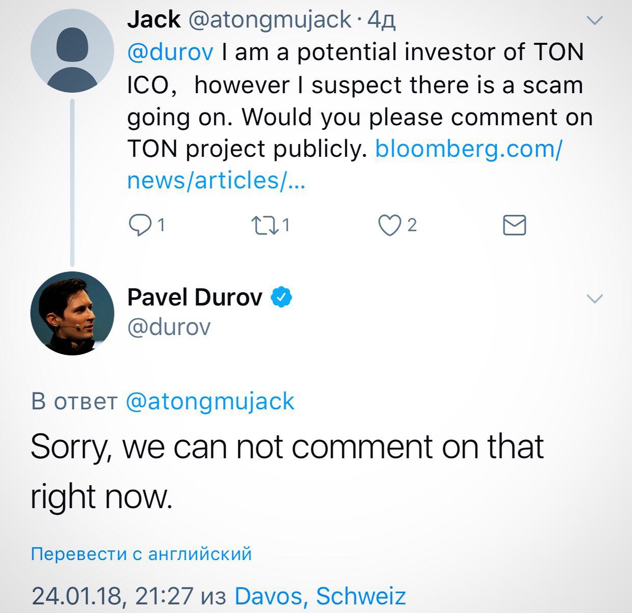 В результате сервис для общения «Телеграмм» превратится в полноценную среду для общения, приложений, обмена информацией. Основатель никак не комментирует ни слухи, ни новости в СМИ. Павел Дуров ограничивается общей рекомендацией: «Следите за обновлениями на официальном сайте. Не доверяйте мошенникам…». Время от времени появляются упоминания, но нет ничего конкретного.