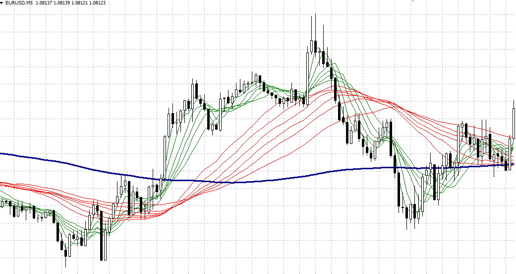 Итак, первым делом нанесите на график шесть индикаторов Moving Average с периодами 3; 5; 8; 10; 12; 15 и присвойте всем им одинаковый зеленый цвет. Далее нанесите шесть индикаторов Moving Average с периодами 30; 35; 40; 45; 50; 60 и присвойте им красный цвет. Также нанесите последнюю скользящую среднюю с периодом 200 и присвойте ей синий цвет. Если вы пользуетесь торговой платформой мт4 мы рекомендуем сохранить шаблон, дабы вам при перезапуске не пришлось проделывать эту процедуру вновь и вновь. Для этого правой кнопкой мыши вызовите дополнительное меню на графике и пройдите в раздел шаблоны, после чего нажмите сохранить шаблон и дайте ему название «Стратегия Гуппи». Если вы выполнили все верно, вы увидите вот такой график перед собой: