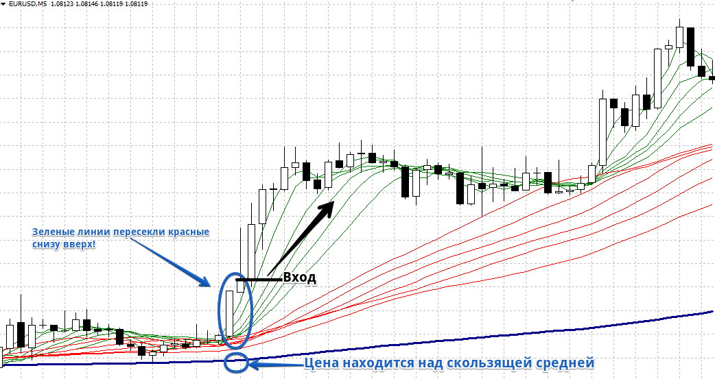 2)Серия из шести скользящих средних зеленого цвета пересекла серию скользящих красного цвета снизу вверх.