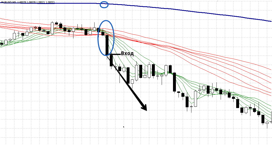 2) Серия из шести скользящих средних зеленого цвета пересекла серию скользящих красного цвета сверху вниз.