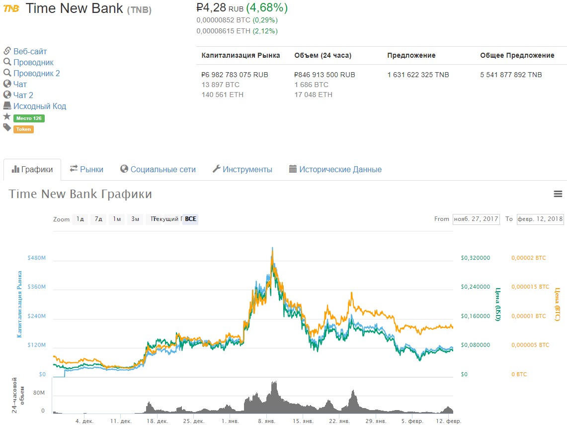 На данный момент (09.02.2018) TNB – это 0,074 доллара или 0,00000856 биткоина. Оборот суточных торгов превышает 5 млн долларов. Общая капитализация валюты составляет 121,6 млн долларов. Всего предусмотрено 5,54 млрд монет.