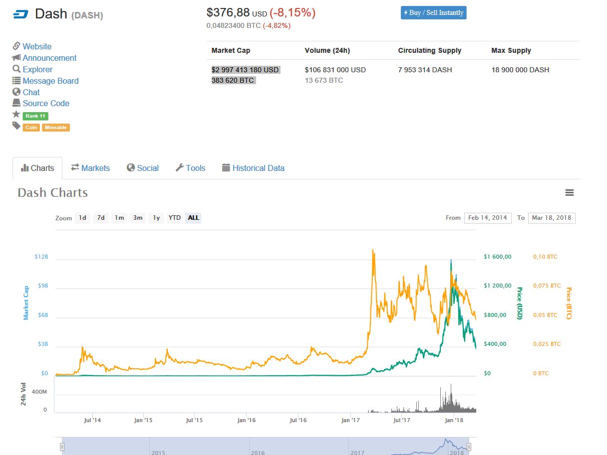 Весной 2018 года 1 монета стоила $376,88 USD (0,04823400 BTC), а Market Cap была на уровне $2 997 413 180 USD (383 620 BTC). Если вы следите за развитием цифровой валюты, то должны быть в курсе нескольких «ребрендингов» (до этого «Дэш» носил названия XCoin и DarkCoin). Собственно, эти наименования отражают суть и ставку на анонимность транзакций.