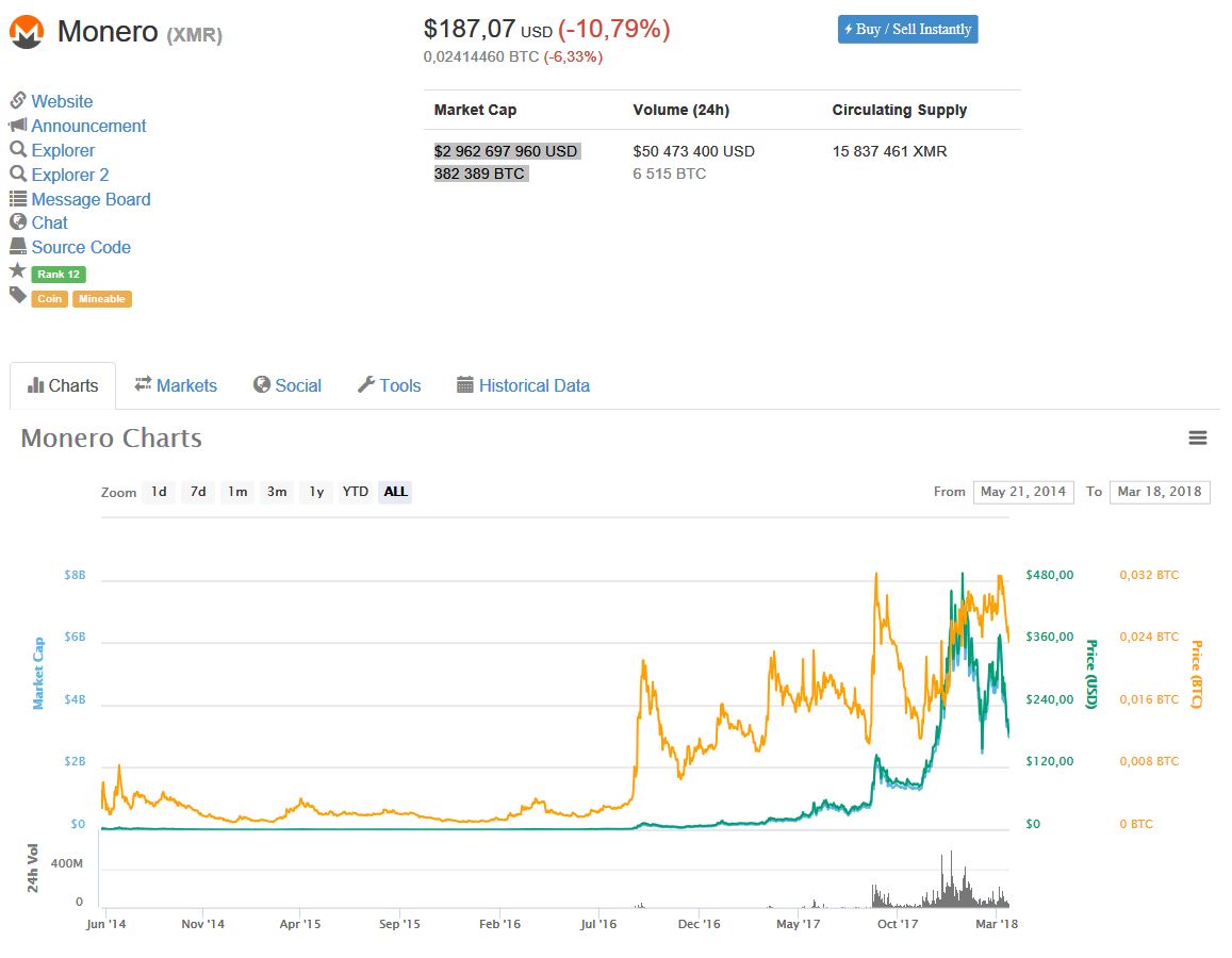 Текущие котировки «Монеро» - $187,07 USD (0,02414460 BTC). Капитализация - $2 962 697 960 USD (382 389 BTC). Для сохранения конфиденциальности клиента используется комплекс технологий.