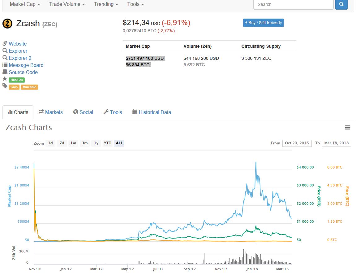 Котировки - $214,34 USD (0,02762410 BTC), рыночная капитализация находится на уровне $751 497 160 USD (96 854 BTC). Столь высокие котировки связаны с тем, что «Зи Кэш» не раз включался в список анонимных криптовалют, а технологией Zk-Starks обеспокоены даже представители ЦРУ.