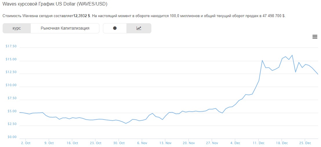 Большинство альткоинов начинали торги с тысячных доллара, а максимальный скачок не превышал 1-2 долларов. С Waves складывается немного другая ситуация. До скачка в 2017 году он сохранял стоимость в 0,2 доллара, после чего вырос до 16 долларов. Как и у других криптовалют, здесь также произошла так называемая коррекция, но курс не упал до центов, а остался на уровне в 2,5 доллара. Несмотря на неблагоприятные ситуации на пути, монета имеет ценность, поскольку пользуется спросом.