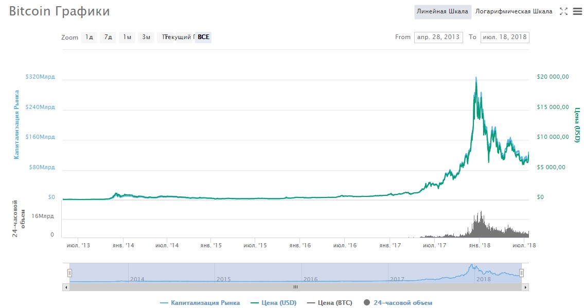 В конце 2017 года биткоин преодолел рекордную психологическую отметку в 20 тысяч долларов. Такой курс не могли спрогнозировать даже эксперты. Конечно, со временем началась корректировка, и уже через несколько недель цена заметно снизилась. Сейчас (16.07.2018) стоимость находится в пределах 6–7 тыс. долларов.