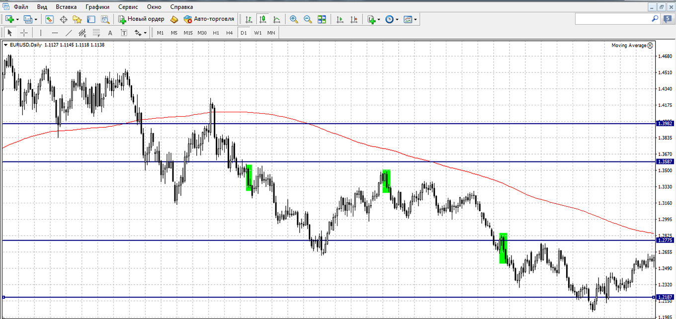 Теперь, желтым у нас помечены некачественные сигналы; зеленым – оптимальные моменты для входа, а розовым ситуации, когда позиция может открываться по желанию трейдера (комбинация начала формироваться под Moving Average, а закрылась над ее уровнем).