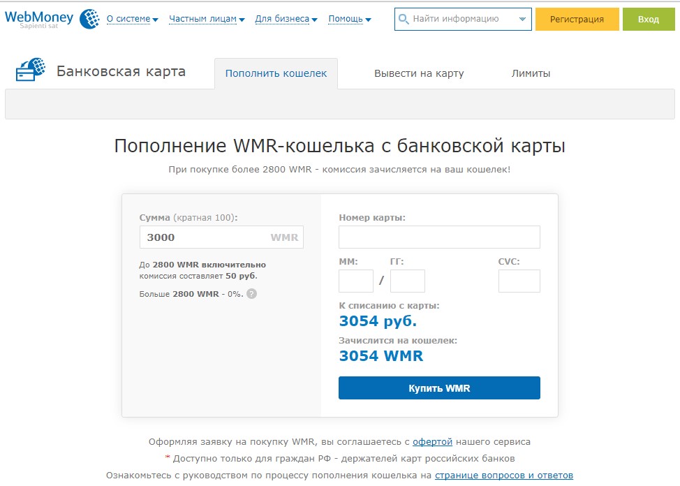 Только для российских карт, комиссия - 50 рублей. При пополнении больше 2800 wmr комиссии нет. Осуществить онлайн-перевод с карты можно на сайте c2c.web.money.