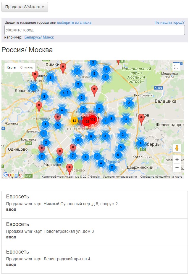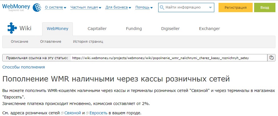 Этот вариант очень удобен, когда нет возможности воспользоваться Интернетом. Для того, чтобы пополнить счет, достаточно зайти в ближайший пункт Связного или Евросети (адреса тут https://wiki.webmoney.ru/projects/webmoney/wiki/popolnenie_wmr_nalichnymi_cherez_kassy_roznichnyh_setey). Чтобы пополнить счет, вам необходимо назвать оператору номер кошелька и сумму, все остальное он сделает сам. Комиссия будет от 2%.