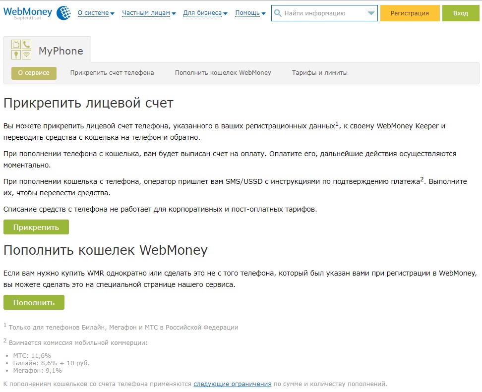 Положить деньги в электронный кошелек с помощью телефона сотовой связи можно так же оперативно и легко, как при использовании терминала. В личном аккаунте номер прикрепляют к кошельку (это делается тут - https://telepay.wmtransfer.com/MyPhone/), затем вводят индивидуальный логин и пароль, входят в свой кабинет и делают заявку на перевод необходимой суммы. После обработки запроса система присылает на ваш мобильник смс-сообщение, где предлагается подтвердить операцию. Воспользоваться данной услугой могут владельцы телефонов, которые обслуживаются такими операторами мобильной связи: